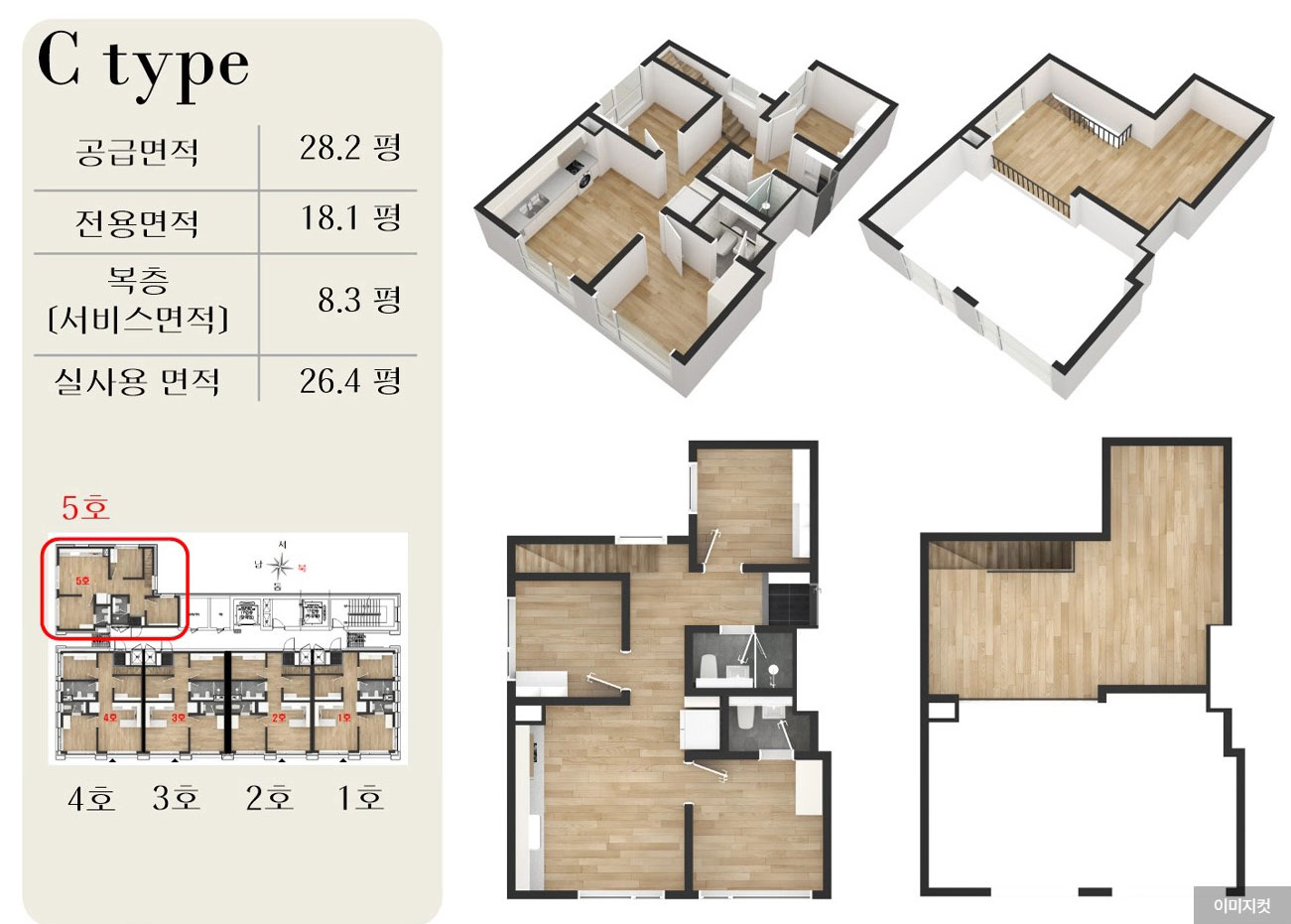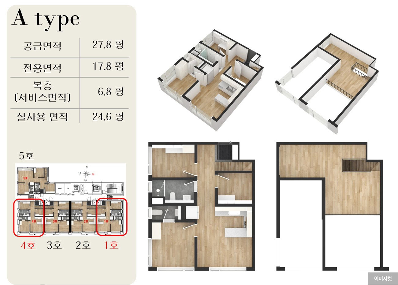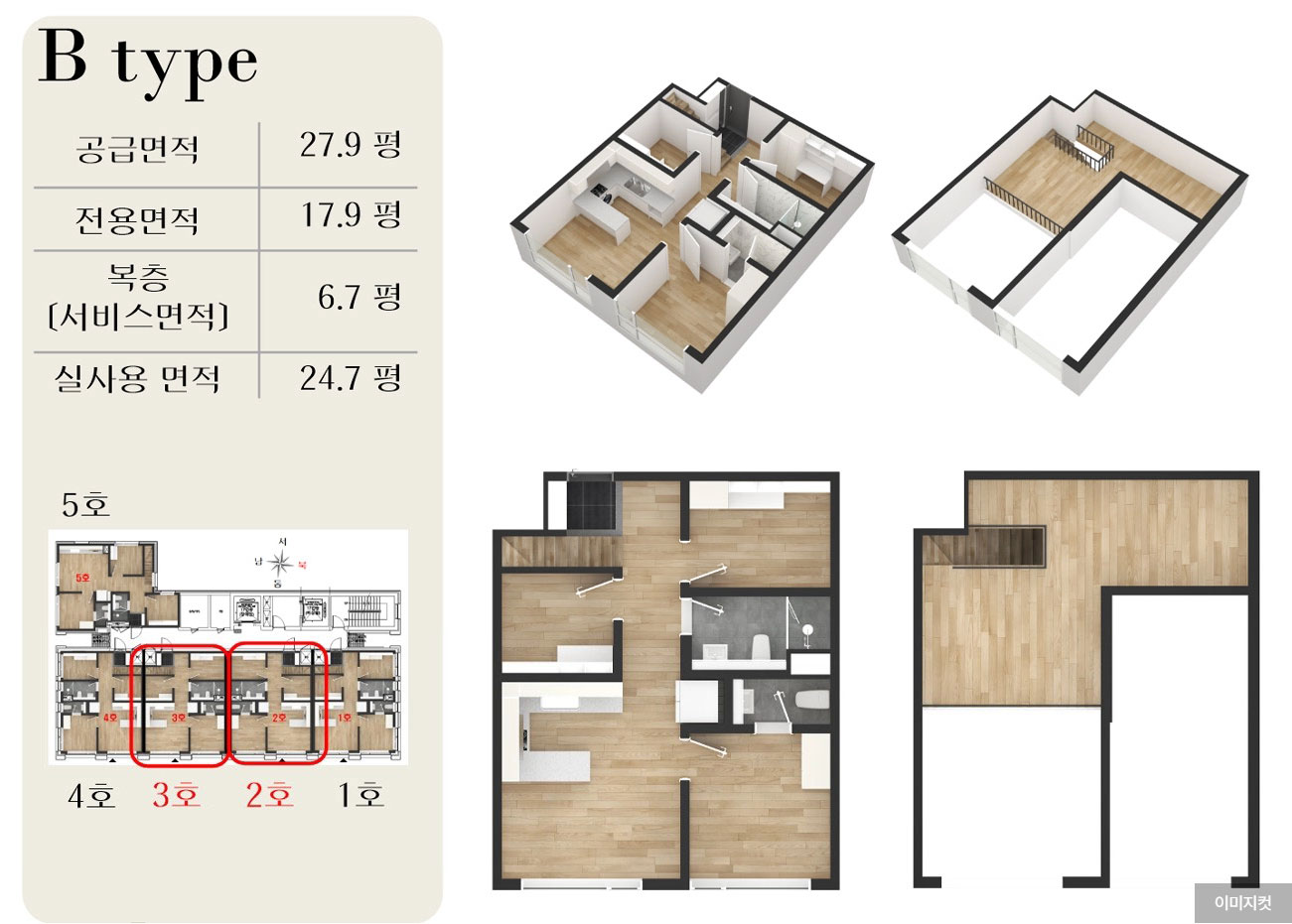 방 3개와 욕실 2개를 갖춘 아파트 타입.