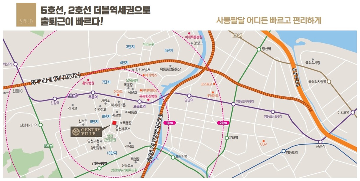 지하철 5호선 오목교역(8번 출구 520m), 목동역(6번 출구 660m), 2호선 양천구청역(1,000m)이 모두 가까운 더블 역세권으로, 강남·강북·수도권까지 출퇴근이 빠릅니다.