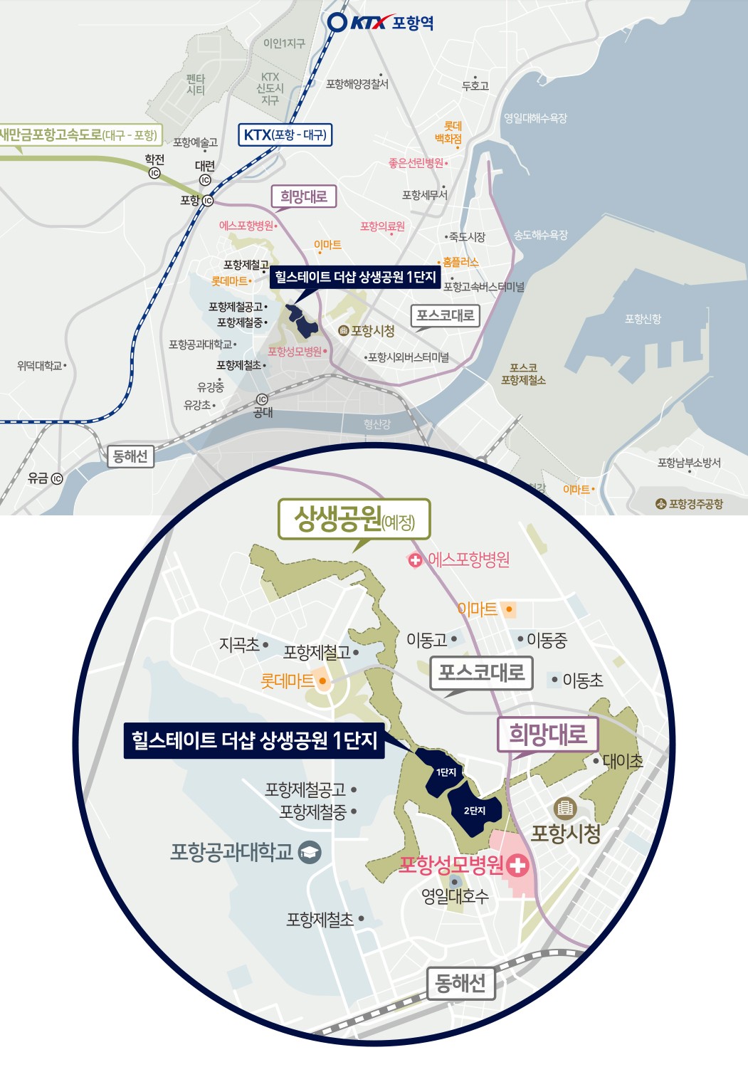 지곡과 이동 사이, 포항시청 앞 중심생활권 이마트, 롯데마트, 포항성모병원 등 생활편의시설 이용 편리