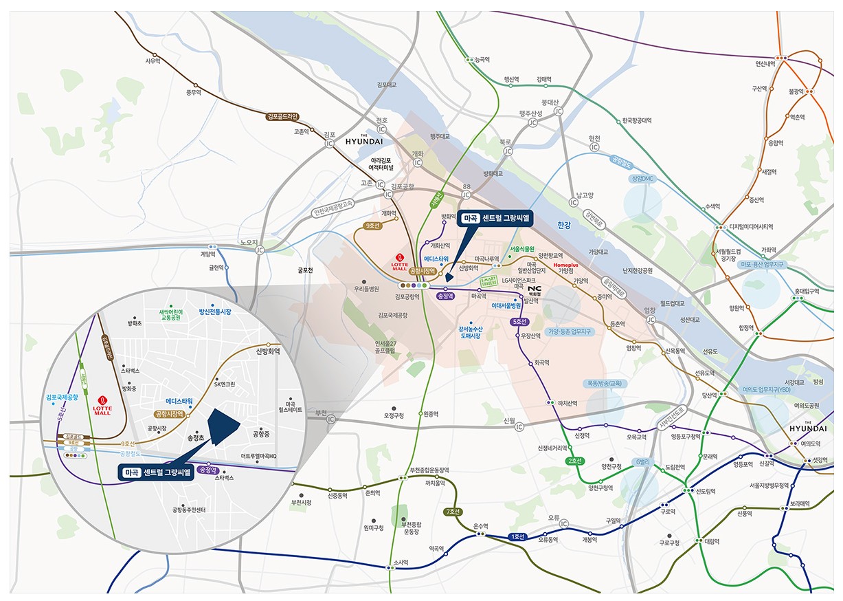 5호선, 9호선, 공항철도, 시해선이 인접한 사통팔단지역